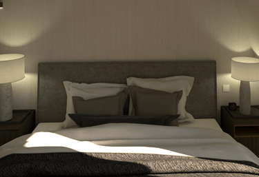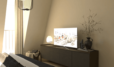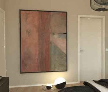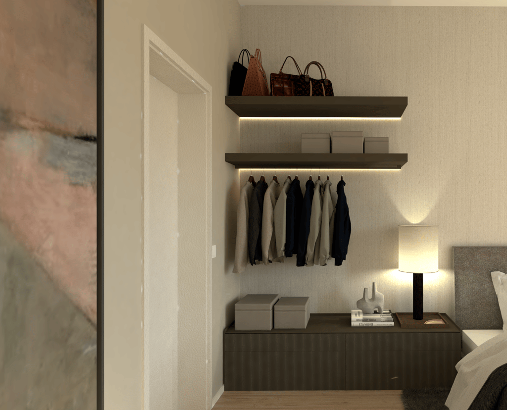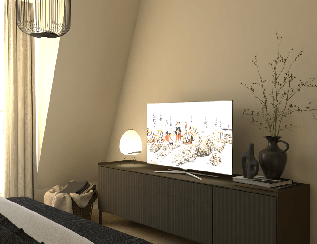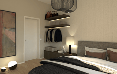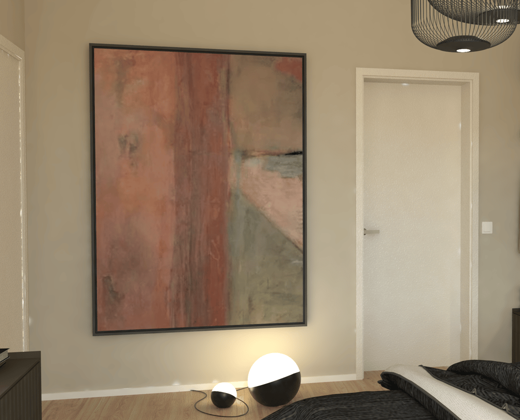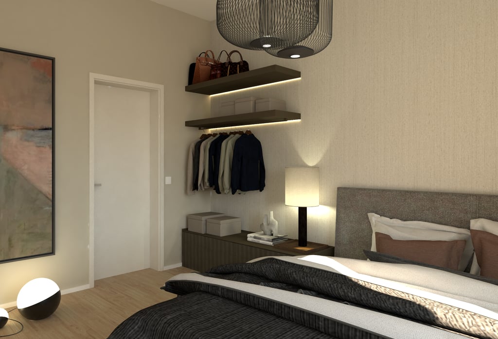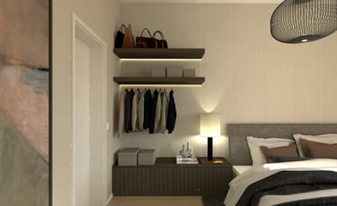 In einem großzügigen Penthouse wurde ein Schlafzimmer gestaltet, das durch gezielte Farbakzente, ausgewählte Kunstwerke und den Einsatz neuer Materialien an Wohnlichkeit und Tiefe gewinnt.