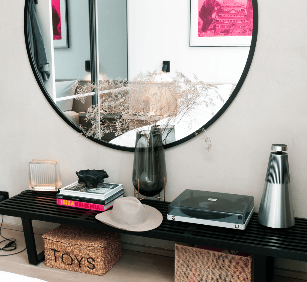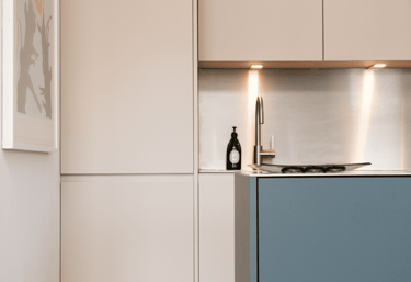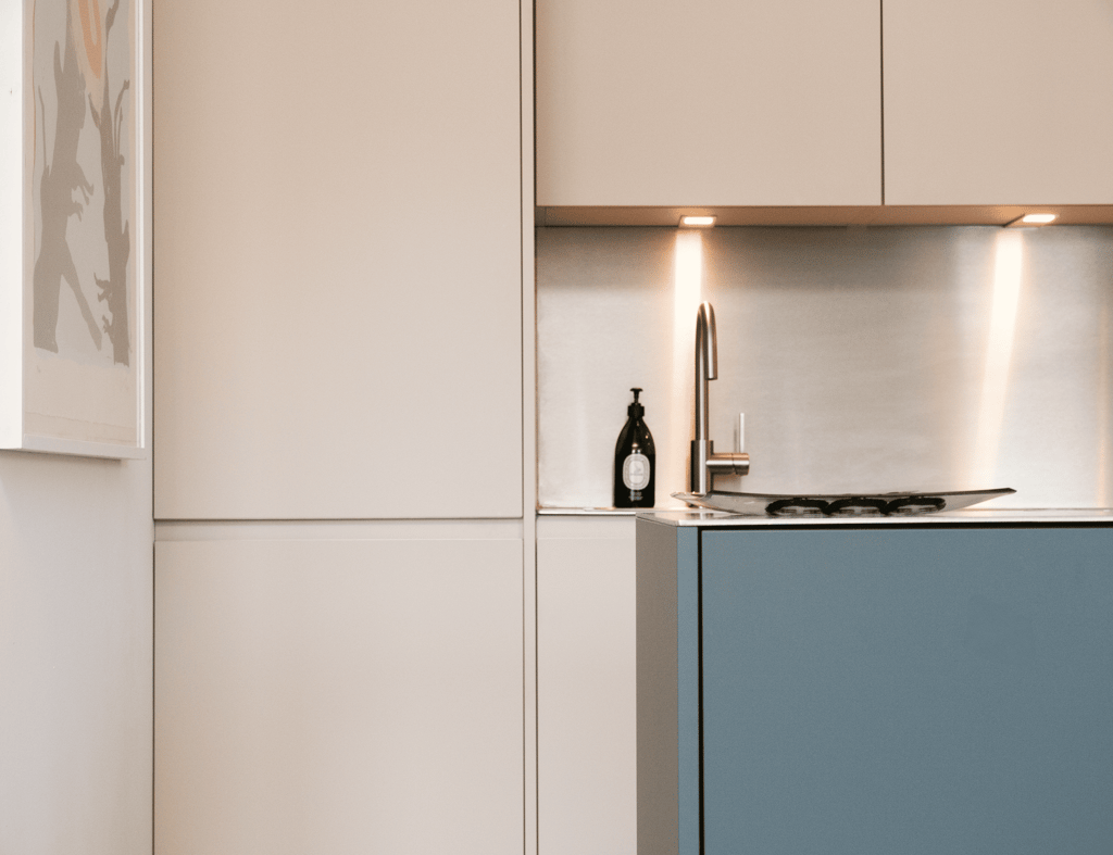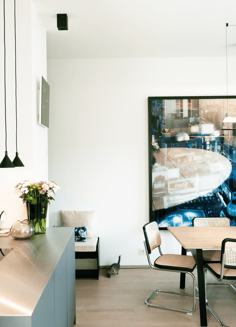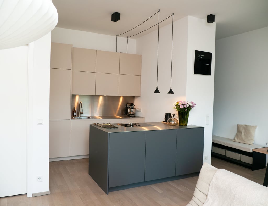 Als Highlights setzen die Edelstahl-Arbeitsplatten in der Küche ein prägnantes Statement, während der Spiegel im Schlafzimmer den Raum optisch erweitert und eine neue räumliche Qualität schafft.