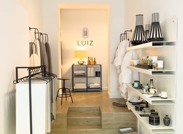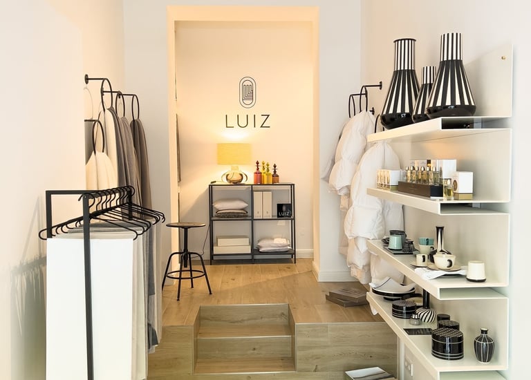 Auf kleinstem Raum wurde eine klare, elegante Präsentationsfläche geschaffen, die die luxuriöse Qualität und die handwerkliche Präzision der Luiz-Produkte unterstreicht.